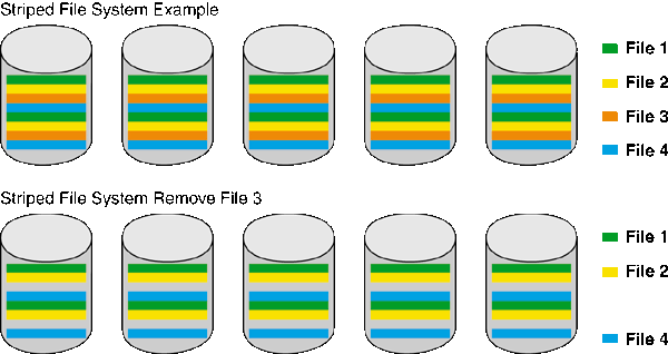 Striped file system with four files and five devices